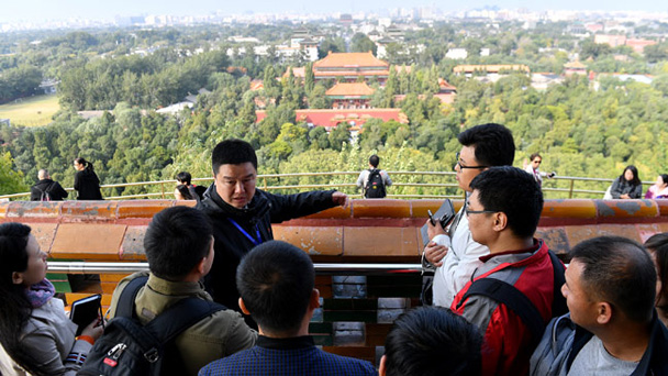 當日,十九大新聞中心組織首場外出參觀采訪活動,25家境內外媒體35名記者,沿著北京中軸線參觀了永定門城樓、景山、鐘鼓樓、奧林匹克塔等經典建筑,了解古都北京的歷史沿革,感受黨的十八大以來古都煥發出的生機活力。