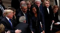 小布什走向賓客的座位時(shí),左手伸進(jìn)西裝口袋拿東西。他與奧巴馬握完手后,將左手中的糖果放至右手,才伸出右手與米歇爾握手,并將手中的糖果塞給她。
