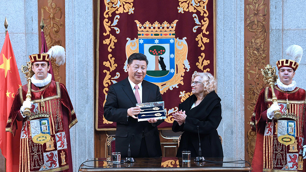 當地時間11月28日,國家主席習近平在馬德里市政廳接受馬德里城市金鑰匙。隨后,卡梅納市長向習近平贈送馬德里城市金鑰匙,全場響起熱烈掌聲。