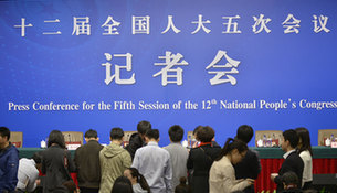 3月10日,十二屆全國人大五次會議新聞中心舉行記者會,邀請中國人民銀行行長周小川、副行長易綱、副行長兼國家外匯管理局局長潘功勝、副行長范一飛就“金融改革與發(fā)展”的相關(guān)問題回答中外記者的提問。圖為記者會現(xiàn)場。