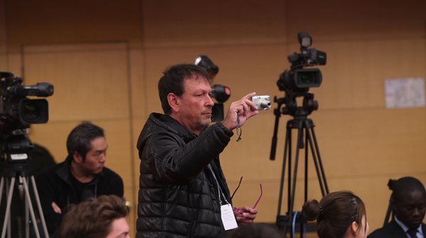 十三屆全國人大一次會議新聞中心3月8日上午10時在梅地亞中心多功能廳舉行記者會,邀請外交部部長王毅就“中國外交政策和對外關系”回答中外記者提問。圖為記者在現場采訪。
