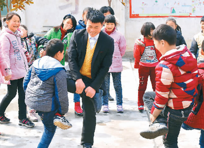 張玉滾在課間與學生們做游戲。人民日報海外版04月17日報道 河南省鎮平縣高丘鎮黑虎廟村是深度貧困村,村里人要想走出大山,得翻越海拔1600多米的八里坡,山高路險,坡陡彎多。