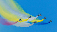 當地時間8月24日14時55分,隨著紅、白、藍三色涂裝的6架殲-10表演機依次升空,中國空軍八一飛行表演隊在俄羅斯國際軍事技術論壇上精彩亮相。