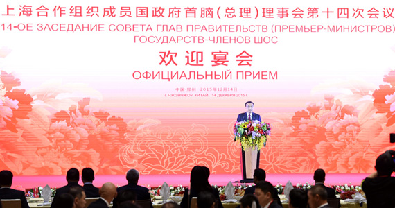 在北京會(huì)見哈薩克斯坦總理后,李克強(qiáng)總理14日下午立即飛赴河南鄭州,出席上海合作組織成員國政府首腦(總理)理事會(huì)第十四次會(huì)議。當(dāng)晚19時(shí)許,李克強(qiáng)與上合組織各國領(lǐng)導(dǎo)人在鄭州相會(huì),共同參觀河南省與上合組織成員國合作成果展,隨后舉行宴會(huì)歡迎外賓。